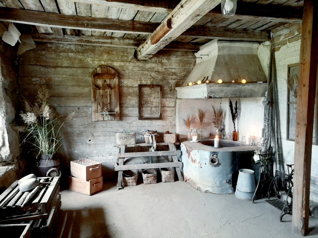 Vanhan navetan maitokeittiö muuttui käden käänteessä ihanaksi keitaaksi kun sille näyettiin hieman rättiä ja luutaa.